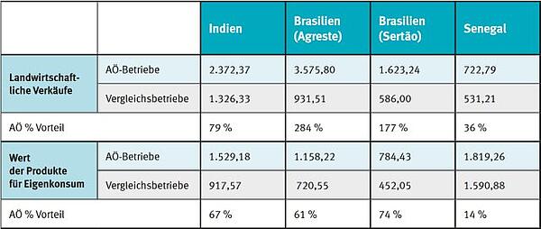 Bäuer*innen in allen drei Untersuchungsregionen erzielten signifikante Einkommenszuwächse, insbesondere aus dem Verkauf landwirtschaftlicher Produkte, und profitierten zudem von höherwertigen Lebensmitteln für den Eigenverzehr. Das Medianeinkommen aus dem Verkauf von Agrarprodukten lag für die agrarökologischen Betriebe in Indien 79 % höher als in der Vergleichsgruppe, in Brasilien 177 bzw. 284 % höher und im Senegal 36 % höher. Betrachtet man den Wert der Lebensmittel für den Eigenkonsum, hatten agrarökologische Bauernfamilien einen Vorteil von 67 % in Indien, von 61 bzw. 74 % in Brasilien und von 14 % im Senegal (siehe Tab. 1, S. 6). Es erwies sich, dass die agrarökologischen Interventionen besonders vorteilhaft für die Armen sind: Während das Bareinkommen aus dem Verkauf landwirtschaftlicher Produkte für alle agrarökologisch wirtschaftenden Familienbetriebe wuchs, verzeichneten die ärmsten Familien einen besonders dynamischen Anstieg: Die 10 Prozent der ärmsten Kleinbäuer*innen in Brasilien und im Senegal steigerten ihr jährliches Einkommen um 65 bis 650 US-Dollar, im Vergleich zu null Dollar Steigerung in der Referenzgruppe. In Indien lag die Steigerung bei den agrarökologisch wirtschaftenden Betrieben mit ca. 430 US-Dollar pro Jahr um fast 500 % höher als bei der Vergleichsgruppe.