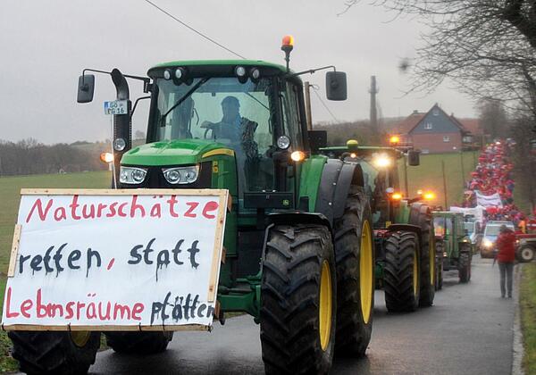 Ein großer Vorteil war, dass sich mit der Zeit eine sehr heterogene Akteursstruktur entwickelt hat. Es hat sich beispielsweise noch ein Ortsverband des BUND gegründet, der ganz andere Möglichkeiten für Klagen und Beschwerden hat, vor allem naturschutzrechtlicher Art. Es hat sich außerdem eine Ortsgruppe von Fridays for Future in Hebenshausen gegründet, durch die wir noch einmal an andere Netzwerke angeschlossen sind. Studierende der Uni Witzenhausen haben eine Initiative zur Erarbeitung von Nutzungsalternativen für die Fläche ins Leben gerufen und auch Scientists for Future ist aktiv geworden. Gerade im Zusammenspiel mit Studierenden der Uni Witzenhausen wurden Aktionen auf die Beine gestellt, die glaube ich auch für die Gemeinde eindrücklich waren. Zum Beispiel wurden für eine Aktion über 50 Schlepper und fast tausend Menschen mobilisiert. Diese Aufzählung an Akteuren erhebt übrigens keinen Anspruch auf Vollständigkeit.