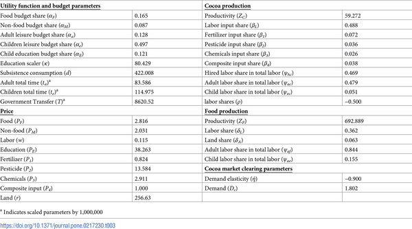 With these shares calibrated, scalar parameter κ in the utility function was calibrated as the residual from the first order condition of child education. The non-cocoa income parameter (T) was calibrated as the residual income such that the full-income constraint holds with equality.