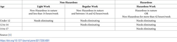 The International Labor Organization (ILO) classifies child labor into three categories: i) worst forms, ii) regular work and worst forms, and iii) light and regular work and the worst forms. The worst forms of child labor are bisected into two categories. The first, hazardous work, is defined as “employment in industries and occupations designated as hazardous or work for long hours and/or at night in industries and occupations not designated as hazardous.” The second, worst forms other than hazardous work, is defined as “children trafficked for work; forced and bonded child labor; commercial sexual exploitation of children; use of children for illicit activities and armed conflict.” While there are many children throughout Africa involved in the worst forms other than hazardous work, this paper and the cocoa industry is focusing on the more prevalent form of child labor in the cocoa industry: hazardous work. Regular work and worst forms constitute employment below the general minimum working age in addition to the worst forms of child labor. Light and regular work and the worst forms also include, in addition to regular work and the worst forms, employment below the minimum working age for light work. According to the ILO, light work includes activities that are not harmful to a child’s health or development and does not affect their school attendance, other vocational training, etc. Table 1 highlights what the International Labor Organization classifies as child labor by age and work type/duration.