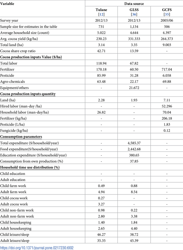 The model presented in the previous section is calibrated to the Ghanaian cocoa market to simulate the effect of removing child labor in cocoa production. This calibration process utilized data from three micro-level sources: (i) the Ghana Living Standards Survey conducted in 2012/13 [37], (ii) Ghana Cocoa Farmers Survey conducted in 2005/06 [36], and (iii) the Tulane Child Labor Survey in Ghana conducted in 2012/13 [12]. All relevant data are within the manuscript and its supporting information files. As summarized in Table 2, these sources provide data on the following variables: the number of cocoa farming households, the value of production inputs per hectare, the annual household budget structure, time use, and cocoa price. Exchange rate used for monetary conversion is 1.954GHC/1$ retrieved from [38]. All monetary values are in 2012/13 USA dollars ($). In addition, data on annual cocoa production and national food balance sheet are obtained from [39], while the price of non-labor production input was collected from the literature [40] and adjusted by inflation.