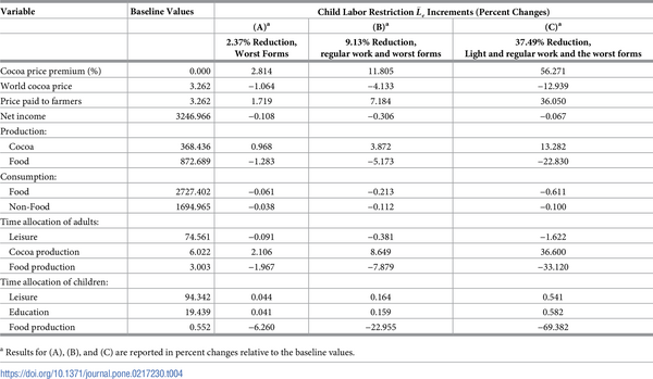 The fall in both cocoa and food production results in adults in the household spending more time at leisure (0.036%, 0.143%, and 0.722%) and less time at cocoa (0.073%, 0.301%, 1.679%) and food (0.736%, 2.953%, 14.562%) production. Interestingly, for the children’s time allocation, the directional impacts of the labor restriction remain unchanged. However, because the decline in food production is smaller than in the first alternate scenario, less time is taken away from food production, and the children spend relatively less time at leisure (0.029%, 0.113%, and 0.446%) and education (0.021%, 0.084%, and 0.348%) compared to those in the first scenario.