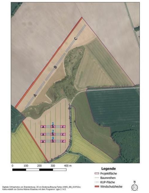 Die KUP soll in den ackerbaulich weniger interessanten Ausbuchtungen nördlich der Schmelzwasserrinne angelegt werden (s.a. Abb. 1) und zu je 40 % aus Robinien und Pappeln bestehen; die weiteren 20 % sollen entsprechend naturschutzfachlicher Empfehlungen von WINTERLING, BORCHERT & WIESINGER (2014) und BIELEFELDT et al. (2008) zu 10 % aus Eberesche (Sorbus aucuparia) und zu weiteren 10 % aus einer vielfältigen Mischung standortangepasster, heimischer Klimax-Gehölze: wie Grauerle (Alnus incana), Hasel (Corylus avellana) und Hainbuche (Carpinus betulus) bestehen. Dies bietet sich insbesondere an, da Vergleichsversuche gezeigt haben, dass die klassischen Klimax-Hartholz-Laubholzbäume eine für FZH optimal geeignete Ligninstruktur aufweisen (LEMIEUX 1996). Die KUP-Fläche soll mit einem einreihigen System im Pflanzabstand von 1,6 x 0,4 m (15.500 Pflanzen /ha) bepflanzt werden.