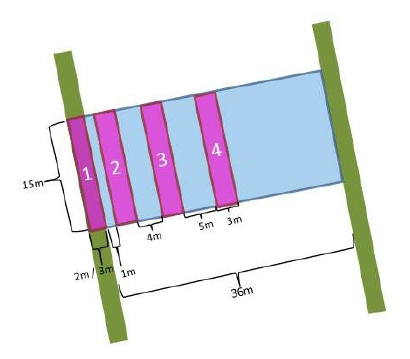 Für die Ableitung wissenschaftlicher, statistisch-signifikanter Aussagen aus den Datenerhebungen werden drei Transekt-Streifen quer zu den Baumreihen über das gesamte Feld gelegt (s.a. Abb. 1: 1abc, 2abc, 3abc). Damit ist eine hohe Anzahl an Wiederholungen möglich. Innerhalb der Transekte findet in klar abgegrenzten Teilflächen eine stichprobenartige Erhebung der Daten statt (s.a. Abb. 2). Zugleich bleibt durch den Versuchsaufbau eine hohe Praktikabilität für den Bewirtschafter gewahrt.