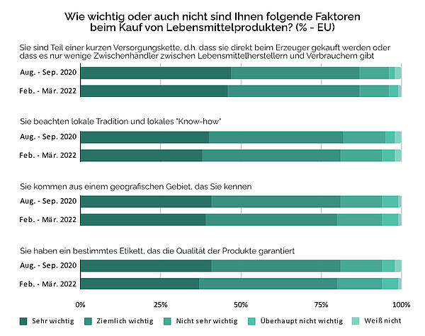 Fast neun von zehn Europäer*innen geben an, dass die Tatsache, dass Lebensmittel Teil einer kurzen Wertschöpfungskette sind, d. h., dass sie direkt beim Erzeuger oder bei der Erzeugerin gekauft werden oder dass es nur wenige Zwischenhändler*innen zwischen Lebensmittelhersteller*in und Verbraucher*in gibt, für sie ein wichtiger Faktor beim Kauf von Lebensmitteln sei (vgl. Europäische Kommission, 2022: 34). Auch die Fragen, ob Lebensmittel lokale Tradition und lokales “Know-how” beachten und ob sie aus einem geografischen Gebiet kommen, das sie kennen, wurden von mindestens 8 von 10 Menschen sowohl 2020 als auch 2022 als wichtig bewertet (vgl. ebd.). Hier gibt es Unterschiede zwischen den Ländern. Die Tatsache, dass bei der Lebensmittelproduktion lokale Tradition und lokales “Know-How” beachtet wurden, findet bei 97 % der Befragten auf Zypern, 94 % der Befragten in Italien, 93 % in Griechenland und 92 % in Slowenien Anklang (vgl. ebd.). In Dänemark sind es hingegen 56 %, in den Niederlanden 58 % sowie in Schweden und Lettland jeweils 68 % (vgl. ebd.). Dass Lebensmittel aus einem geografischen Gebiet kommen, das die Befragten kennen, ist für 94% in Italien, 91 % in Griechenland und auf Zypern, und jedoch nur bei 50 % der Befragten in den Niederlanden, 62 % in Dänemark und 72 % in Belgien und Litauen wichtig (vgl. ebd.).