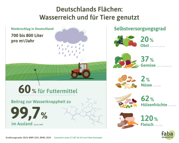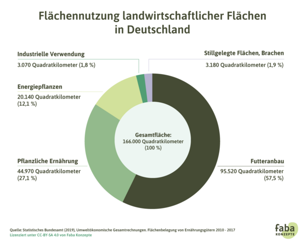 In Deutschland werden sogar gut 50 % der Landesfläche für die Landwirtschaft genutzt. 16 Auch hier dient davon ein großer Teil der sogenannten Nutztierhaltung: Auf ca. 60 % wird Futter erzeugt. 17