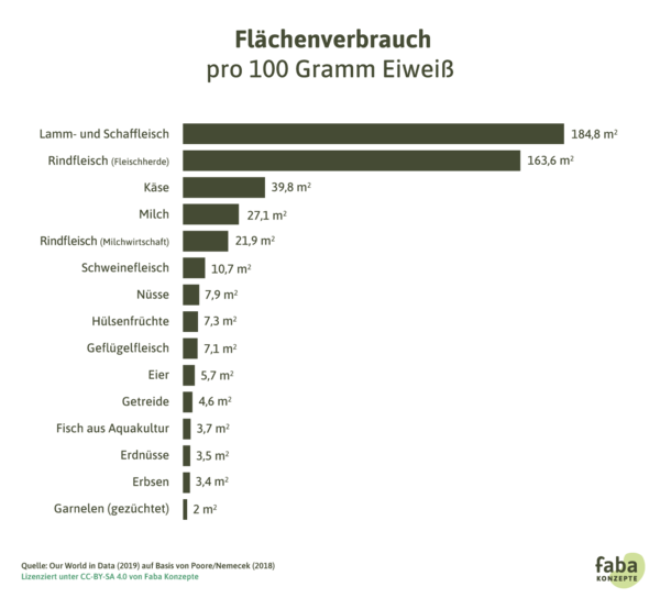 Fleisch, Milch und Eier sind also im Hinblick auf die Flächennutzung ineffizient. Das liegt unter anderem daran, dass immer nur ein Teil der verfütterten Nährstoffe in den Produkten landet. So muss man zum Beispiel im globalen Schnitt 4 kg bis 26 kg pflanzliches Eiweiß verfüttern, um 1 kg tierisches Eiweiß zu gewinnen. 21 Dabei ist Rindfleisch besonders flächenintensiv, weil Rinder mindestens zum Teil von Grünland ernährt werden, das im Vergleich zum Acker weniger Futter pro Fläche liefert. 22 Die Unterschiede im Flächenbedarf verschiedener Nahrungsmittel sind sehr groß.