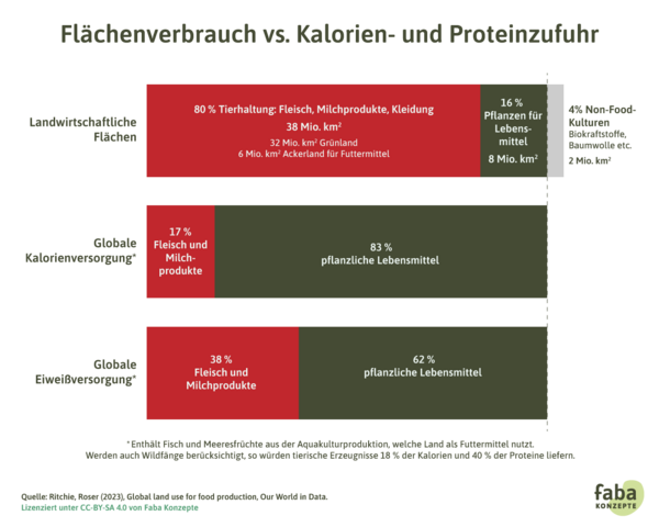 Du denkst jetzt vielleicht, dass die Tierhaltung zwar viel Land beansprucht, aber dafür mit Fleisch, Milch und Eiern auch wichtige Nahrungsmittel bereitstellt – und wir müssen uns schließlich von irgendetwas ernähren. Tatsächlich leisten Tierprodukte aber im Verhältnis zur Fläche einen ziemlich kleinen Beitrag zur Welternährung: Obwohl dafür 80 Prozent der landwirtschaftlichen Fläche verwendet werden, liefern Tierprodukte nur 17 Prozent der weltweit verzehrten Kalorien und 38 Prozent der Proteine (dabei sind Nährstoffe aus Fischerei nicht mitgerechnet). 15 Umgekehrt kann man sagen: Auf unter 20 Prozent der landwirtschaftlichen Flächen werden aktuell 83 Prozent der Kalorien und 62 Prozent der Proteine erzeugt – mithilfe von pflanzlichen Nahrungsmitteln.