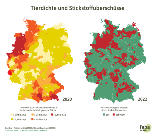 Die Tierhaltung ist Teil dieses Problems: Die Tierzahlen sind zu hoch für die vorhandenen Flächen, auf denen die entstehende Gülle ausgebracht werden kann. 35 Es entsteht zu viel Gülle an einem Ort. Das sieht man besonders dort, wo die Tierdichte hoch ist, zum Beispiel in Niedersachsen, Teilen von Nordrhein-Westfalen oder Niederbayern. Überschüssige Gülle wird hier zum Teil sogar in andere Regionen transportiert. 36, 37