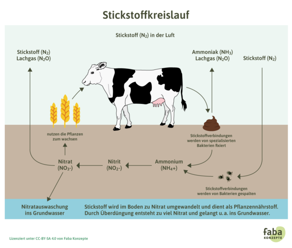 Werden die Pflanzen nun von Tieren gefressen, nehmen diese die stickstoffhaltigen Verbindungen und Proteine auf, verdauen sie und scheiden den nicht verwerteten Teil davon wieder aus. Die ausgeschiedenen Verbindungen, zum Beispiel in Form von Gülle, werden mit Hilfe von Pilzen und Fäulnisbakterien zersetzt. Dabei entsteht wieder Ammonium – dieses gelangt dann in den Boden und kann erneut zu Nitrat umgewandelt und von Pflanzen genutzt werden.