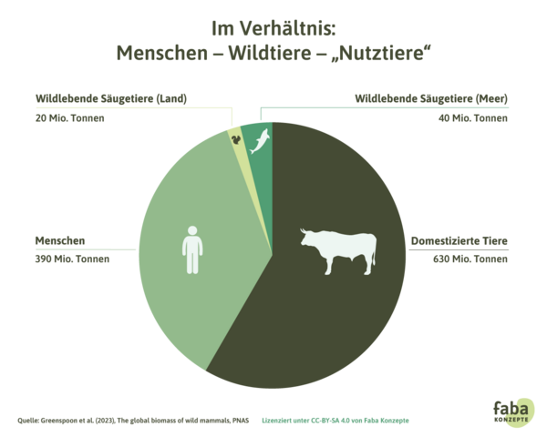 Einen viel höheren Anteil an der Gesamtbiomasse aller Säugetiere haben aber die domestizierten Tiere, nämlich ca. 630 Millionen Tonnen. Diese setzen sich neben sogenannten „Haustieren“ wie Hunden oder Katzen vor allem aus den sogenannten „Nutztieren“, also Rindern, Büffeln, Schweinen, Schafen, Ziegen und anderen zusammen. Die Säugetiere, die für die Produktion von Fleisch, Milch oder Kleidung genutzt werden, wiegen zusammengerechnet mit etwa 600 Millionen Tonnen insgesamt etwa 30-mal so viel wie alle wild lebenden Landsäugetiere. 9 Im Verhältnis zur Gesamtmasse aller Säugetiere machen die wild lebenden nur sechs Prozent aus.