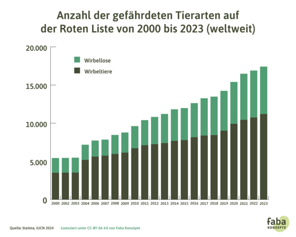 - Laut einem UN-Bericht aus dem Jahr 2019 sind ca. eine Million von acht Millionen Arten vom Aussterben bedroht – Tendenz steigend. Expert*innen sprechen daher sogar davon, dass das sechste große Massenaussterben begonnen habe. 4,5